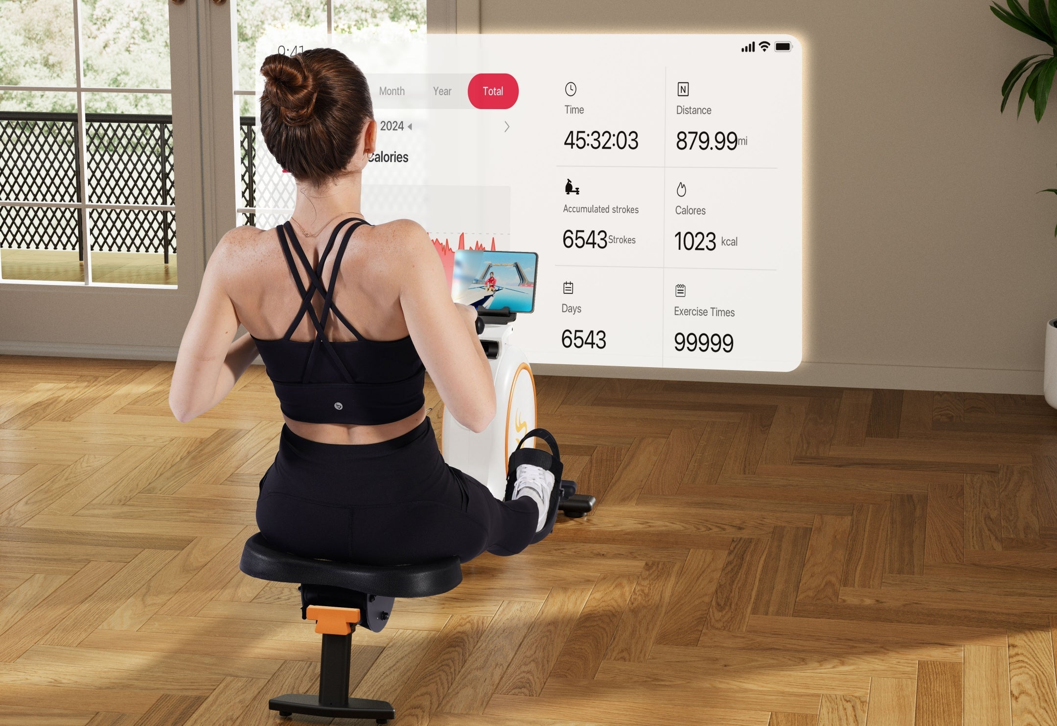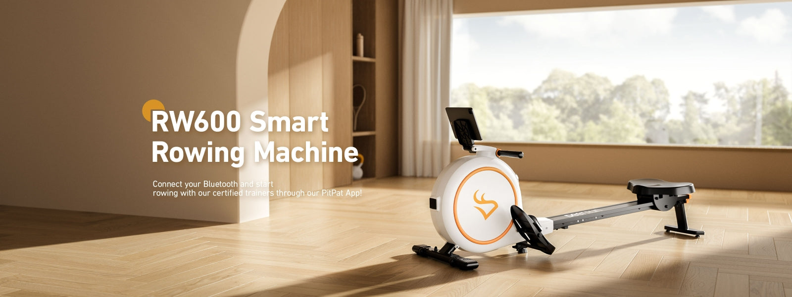 RW600 Smart Rowing Machine: Full-Body, Low-Impact Workout. Connect Bluetooth to our PitPat App and row with certified trainers for a low-impact, full-body workout. Enjoy smooth, silent operation with 32 adjustable resistance levels, while tracking your progress on the LED display. Engage with friends online and experience rowing in nature from your living room!